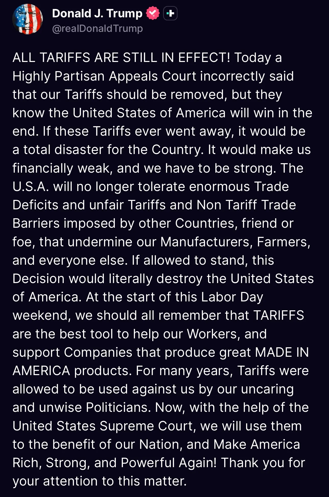 An Emergency non-Emergency Post Holy tariff mess, Batman ....... Wow. An appeals court, backing up the Court of International Trade, has just ruled the majority of Trump’s tariffs illegal. We kind of knew this was coming, but the reality still comes as a shock. ........ The court didn’t say that tariffs per se are illegal. It said that the procedure Trump used to impose tariffs — declaring an economic emergency, then setting tariff rates without so much as consulting Congress, let alone passing legislation — is illegal. If Trump wants to pass a tariff bill, the same way he passed his One Big Beautiful Bill, OK. (I mean, terrible policy, but legal.) ......... True, the International Economic Emergency Powers Act gives the president substantial room to set tariffs during an, um, economic emergency. But Trump himself keeps saying that the economy is in wonderful shape, booming without inflation, and any claims to the contrary are fake news. So how can things both be terrific and an emergency calling for drastic action? ........ I have no idea what happens next. The Supreme Court is utterly craven, and may well rule that Trump gets to do whatever he wants. But maybe even they will balk.