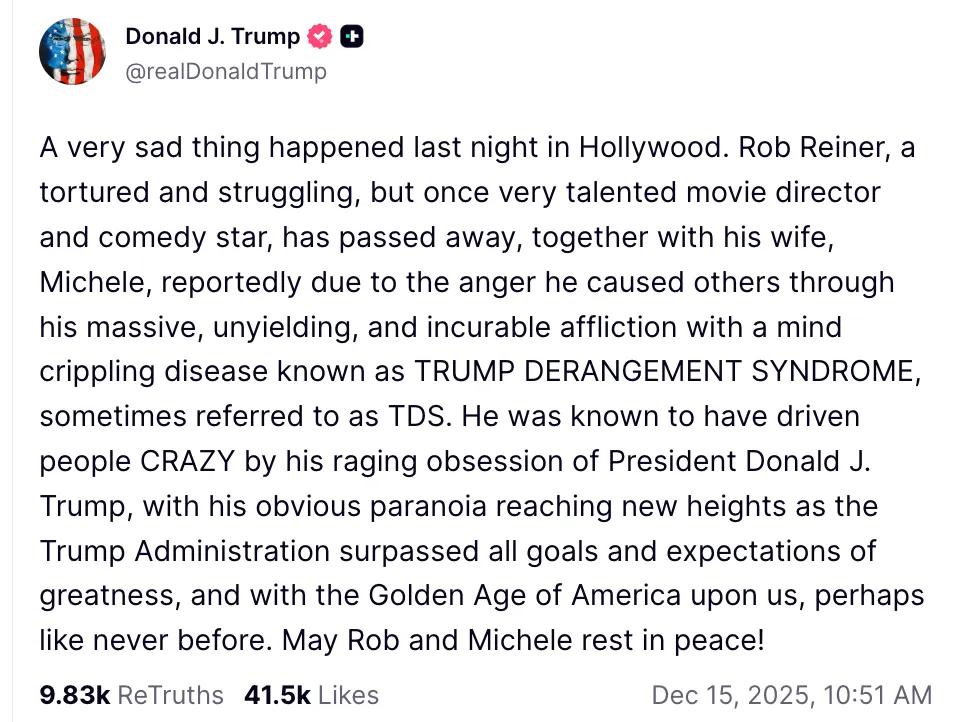 The real threat in Trump’s madness I hate to say this, but it must be faced .......... I couldn’t sleep last night because I kept thinking about Trump’s response to the deaths of Rob and Michele Reiner. ............ “Rob Reiner, a tortured and struggling, but once very talented movie director and comedy star, has passed away, together with his wife, Michele, reportedly due to the anger he caused others through his massive, unyielding, and incurable affliction with a mind crippling disease known as TRUMP DERANGEMENT SYNDROME, sometimes referred to as TDS. He was known to have driven people CRAZY by his raging obsession of President Donald J. Trump, with his obvious paranoia reaching new heights as the Trump Administration surpassed all goals and expectations of greatness, and with the Golden Age of America upon us, perhaps like never before. May Rob and Michele rest in peace.” ....................... Jenna Ellis, Trump’s former lawyer who’s now a conservative radio host, wrote that “this is a horrible example from Trump (and surprising considering the two attempts on his own life) and should be condemned by everyone with any decency.” New York Times columnist Bret Stephens said: “We are led by the most loathsome human being ever to occupy the White House.” .................. “In every grotesque social media post; in every cabinet meeting devoted, North Korea-like, to adulating him; in every executive-order-signing ceremony intended to make him appear like a Chinese emperor; in every fawning reference to all the peace he’s supposedly brought the world; in every Neronic enlargement of the White House’s East Wing; in every classless dig at his predecessor; in every shady deal his family is striking to enrich itself; in every White House gathering of tech billionaires paying him court (in the literal senses of both “pay” and “court”); in every visiting foreign leader who learns to abase himself to avoid some capricious tariff or other punishment — in all this and more, our standards as a nation are being debased, our manners barbarized.” .............. I’ve worked for three presidents, one Republican and two Democrats. I’ve seen presidents up close. The job is overwhelmingly difficult. It takes a toll. But I have never seen anything remotely like what has happened to Donald Trump......... If Trump was once rational, he no longer is. ................ His response to the Reiner killings, like his AI post on October 18 in which he defecated on millions of protesters, reveals a depth of paranoia and grandiosity worse than anything he has shown before. ................ His chief of staff, Suzy Wiles, told Chris Whipple in an interview that appeared in Tuesday’s Vanity Fair that Trump has an “alcoholic’s personality” because he “operates [with] a view that there’s nothing he can’t do. Nothing, zero, nothing.” .................. Here’s a man who thinks Rob and Michele Reiner were murdered because they had a “raging obsession” with him. A man who, according to his current chief of staff, has the personality of an alcoholic with delusions of omnipotence. ........... Trump must be removed from office as soon as possible. ...... Either Section 4 of the 25th Amendment must be invoked — because he is “unable to discharge the powers and duties of his office” — or he must be impeached and convicted under Section 4 of Article II of the Constitution for “treason, bribery, or other high crimes and misdemeanors.”