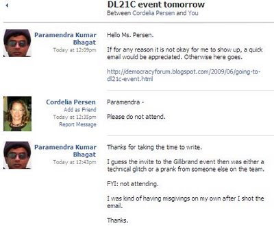 I have decided to go to the DL21C event tomorrow. I have no interest in Bill Thompson. I have no interest in the mayoral race, period. But I gave my shout out to Bloomberg back in December. Better - way better - Gillibrand (Kirsten Gillibrand Is A Good Choice) than Thompson, but oh well. I guess I want to play my small part in rapprochement. Peace out.